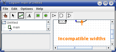 When you have an incompatibility error outside the part of the canvas you are currently viewing, Logisim will helpfully draw an arrow to tell you where you can find the error.