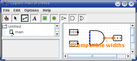 Logisim insists that you never connect two different bit widths together. When it detects that you have done this, it will display an orange error message saying "Incompatible widths."