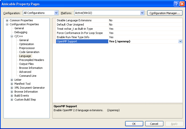 In order to allow parallel execution, we first have to enable it in the compiler. Click on the menu labeled Project, then click the last item that reads Project NameProperties In the tree on the left choose Configuration Properties → C/C++ → Language. Then set the option labeled OpenMP Support to Yes.
