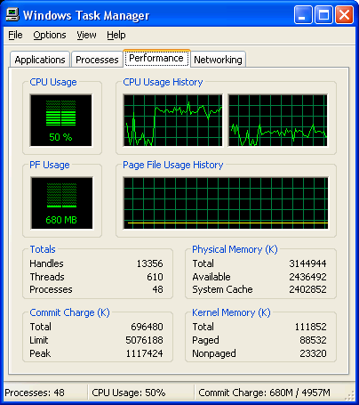 You can see how your program is making poor use of the processor by opening up the Windows Task Manager. To open this, right click on the Windows task bar (at the bottom of the screen) and choose the option that says Task Manager. This will show you a graph representing how much each processor is being utilized. Notice that when you run your program, one processor goes up fairly high, but the other processor stays down.