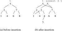 The traditional implementation of insertion, where we search down to where the inserted value belongs along the tree's fringe and change the pointer there to point to a node, won't work in a persistent structure, because of that “change the pointer” step. Insertion, then, is written differently: Instead of changing the pointer, we'll create a leaf and re-create the nodes leading down to the leaf, but maintain the subtrees unvisited during the insertion process. In the figure below, note how after the insertion, both the original tree and the inserted tree are available (though with different roots).