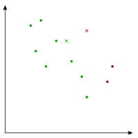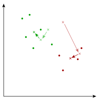 After choosing two random centers, which I've diagrammed as red and green X's above, for each point we figure out which center is closest. In the above diagram, I've colored each point red or green to illustrate which center it is closest to.