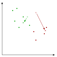 After breaking our points into two groups, we then take the center among each group, and we move the “center” to this computed center.