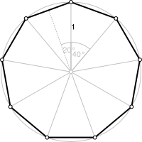 As an example of a program using these, here is a program that computes the area of a regular n-gon inscribed into a circle with radius 1, where n is an integer typed by the user. At right is diagrammed such a nonagon (n = 9)