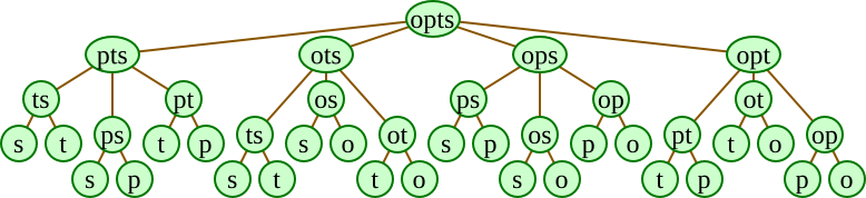 For the four-letter string opts, we go through the following recursion tree.