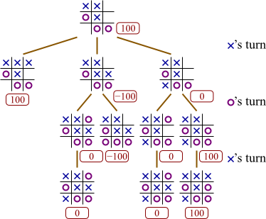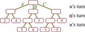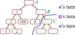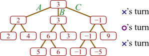 In this tree, high numbers represent good boards for X, and it is currently X's move. (As you can see, X has three possible moves from which to choose, labeled A, B, and C.)