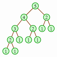 The root's great-grandchild 2 (whose parent is 3, which is below 5) has one child, labeled 1.