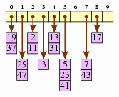 [Bucket 0 contains 19 and 37. Bucket 1 contains 29 and 47. Bucket 2 contains 2 and 11. Bucket 3 contains 3. Bucket 4 contains 13 and 31. Bucket 5 contains 5, 23, and 41. Bucket 6 is empty. Bucket 7 contains 7 and 43. Bucket 8 contains 17. Bucket 9 is empty.]