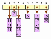 [Bucket 0 is empty. Bucket 1 contains 11, 31, 41. Bucket 2 contains 2. Bucket 3 contains 3, 13, 23, 43. Bucket 4 is empty. Bucket 5 contains 5. Bucket 6 is empty. Bucket 7 contains 7, 17, 27, 47. Bucket 8 is empty. Bucket 9 contains 19, 29.]