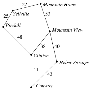 Use A* search to determine the shortest route from Clinton to Mountain Home using the map at right. For your heuristic, use the straight-line distance (as the crow flies) from each town to Mountain Home, as follows.