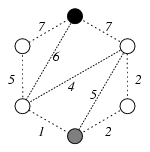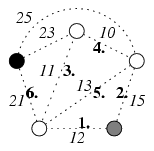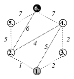 [There is a tie in choosing between the fourth and fifth edge. The answer reversing the order of these two edges is also correct.]