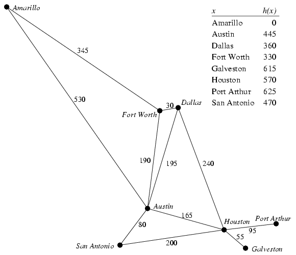 Suppose we find ourselves stuck in the middle of Houston and we want to get to Amarillo. (These problems don't have to be realistic, do they?) We have in our hands the following simplified road map of Texas, and we decide to use the A* algorithm. List the cities in the order they are placed into visited. (Note that not all cities will necessarily be visited in the course of the algorithm.)