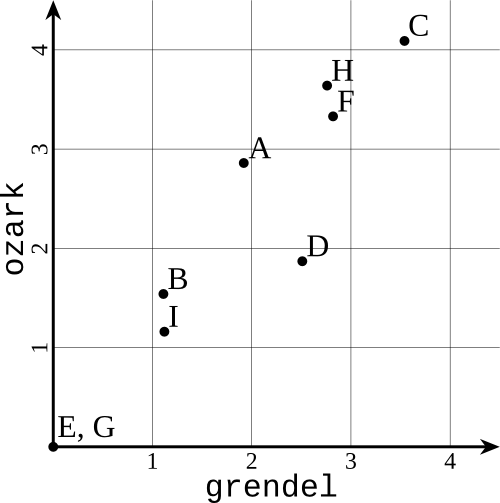 Altogether there were nine solutions to Assignment 1. The following table summarizes the last four numbers reported in the assignment: the ratio of grendel or ozark to a lab computer on each of the two benchmark programs. The graph at right plots the relative performance of grendel and ozark according to each solution, measured as the geometric mean of the two ratios for each computer.