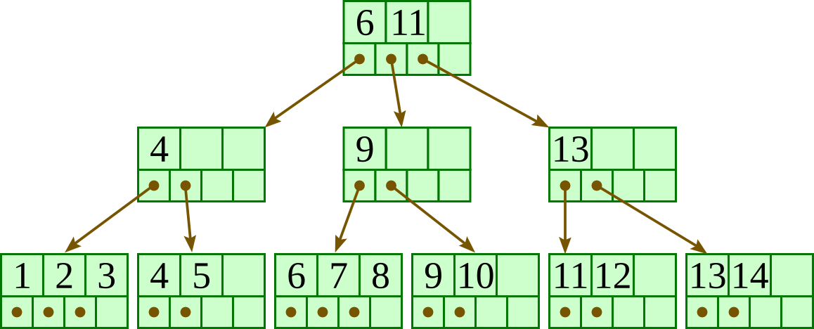 For the below B+-tree, each node contains up to three keys and four pointers. Show the B+-tree that would result by deleting 11 as described in class.