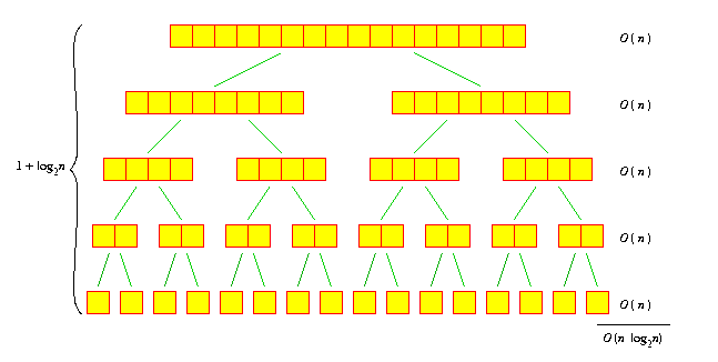 We'll sum up the times for each node, by summing by horizontal levels. For each level, the sum of the times for each node is O(n). Since the size of the arrays in each level halves each time we go down, we can immediately see that there are 1 + log2 n levels. So the total amount of time is O(n log2 n).