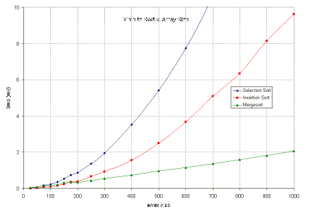 You can see that for small arrays (less than 200 elements), all three techniques do well (and in fact sometimes Mergesort does worse than the other two). But, as the arrays get to be moderately large, it quickly does quite a bit better.