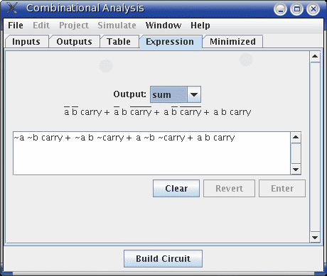 Debajo estará la expresión minimizada que se corresponda con la tabla, con el mismo formato que en la pestaña de expresiones. Si hay más de cuatro entradas, la tabla de Karnaugh no aparecerá, pero aún así se calculará la expresión minimizada. (Logisim utiliza el algorimo de Quine-McCluskey para calcular la expresión minimizada. Esto es equivalente a la tabla de Karnaugh, pero se puede aplicar independientemente de número de variables de entrada.)
