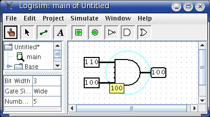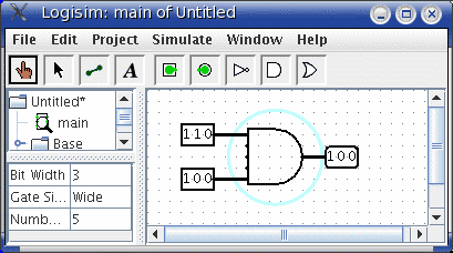La captura de pantalla de abajo muestra un circuito que realiza el AND de dos cables de entrada que tienen tres bits; cada pin de entrada tiene su atributo llamado Número De Bits configurado para recibir tres bits, como se indica en los atributos de la puerta AND mostrada.