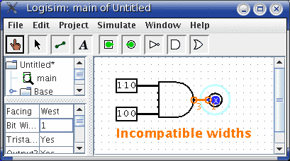 En los componentes todos las entradas y las salidas deben de tener definidos su número de bits. Sin embargo, el número de bits de los cables no tiene que estar definido, se adapta al número de bits del pin al que es conectado. Si un cable conecta dos componentes que están utilizando un número de bits diferente, Logisim mostrará un error de "Ancho incompatible" e indicará los puntos donde se ocasiona el problema en naranja. Debajo, se ha cambiado el atributo Número de Bits del pin de salida a 1 y Logisim muestra un error indicando que no puede conectar un punto de un bit con uno de tres.