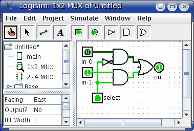 Mientras que en el subcircuito puedes cambiarlo como quieras; cualquier cambio a los valores de los pins será propagado al circuito contenedor. (Si intentas modificar el valor de un pin utilizando la Herramienta de Cambio, Logisim lanzará un cuadro de diálogo para preguntarte si quieres crear un nuevo estado o no; responder que Sí (Aceptar) separará el estado visto en el subcircuito del visto desde el circuito contenerdor, mientras que responder que No(Cancelar) no permitirá el cambio de valor del pin.)