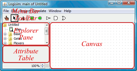 All Logisim is divided into three parts, called the explorer pane, the attribute table, and the canvas. Above these parts are the menu bar and the toolbar.