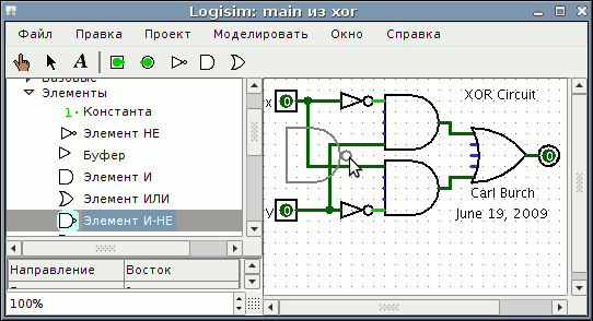 Logisim организует инструменты в библиотеки. Они отображаются в виде папок в панели проводника; для доступа к компонентам библиотеки вам нужно дважды щёлкнуть соответствующую папку. Ниже я открыл библиотеку Элементы и выбрал инструмент И-НЕ из неё. Вы видите, что Logisim теперь готов добавить элемент И-НЕ в схему.