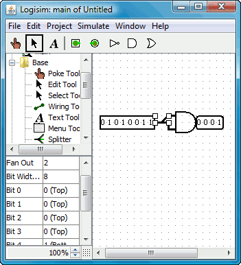 For example, suppose we want to build a circuit that computes the bitwise AND of the two nibbles of its eight-bit input (the upper four bits and the lower four bits). We will have an eight-bit value coming from the input pin, and we want to split that into two four-bit values. In the below circuit, we have used a splitter to accomplish this: The 8-bit input comes into the splitter (which resembles a bird's foot), which divides the 8 bits into two 4-bit values, which are then fed into the AND gate and from there to the output.