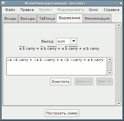 Для каждой выходной переменной окно Комбинационный анализ поддерживает две структуры - соответствующую колонку таблицы истинности и логическое выражение - указывающее, как каждый выход связан со своими входами. Вы можете редактировать и таблицу истинности и выражение; одно будет автоматически менять другое по мере необходимости, чтобы они соответствовали друг другу.