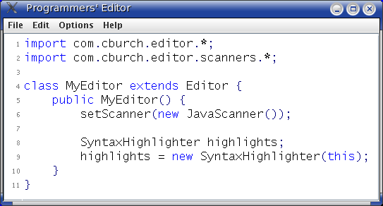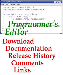 ![]() Screen shot of the com.cburch.editor v0.1.1 demo, released July 2005 This library of Java 5.0 classes implements an editor with syntax highlighting, parenthesis matching, automatic indentation, and line numbers. It helpfully points out unmatched braces, and hovering your mouse over an erroneous token can give a helpful tool tip explaining the problem. The library is a programmer's editor in three ways.