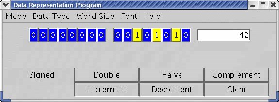 Data Representation allows the user to experiment with how numbers are represented in bits for computer storage. The program supports a variety of numeric formats, including unsigned integers, two's-complement integers, and floating-point format. It also allows the user to write unsigned numbers in octal or hexadecimal.