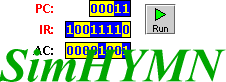![]() Screen shot of SimHYMN v1.0d, released February 2004 SimHYMN simulates a simple 8-instruction CPU and 32-byte memory designed for learning about how a CPU executes a program. The CPU contains three registers: IR (instruction register), PC (program counter), and AC (accumulator). The eight instructions are as follows.